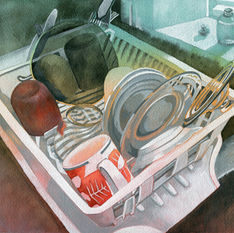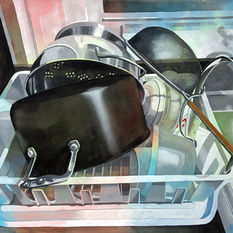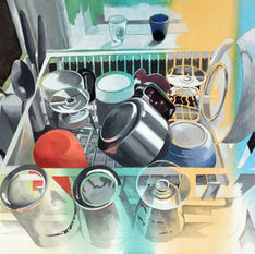 The repetitive, meditative quality of some household tasks is not a far stretch from the actual activity of painting the scene. There is enjoyment in bringing order, even harmony, to a random arrangement of objects, shapes and colors. The drama and tension between flat shapes, lines of perspective, light and shadow and color are all played out on the picture plane.